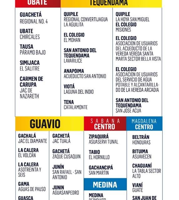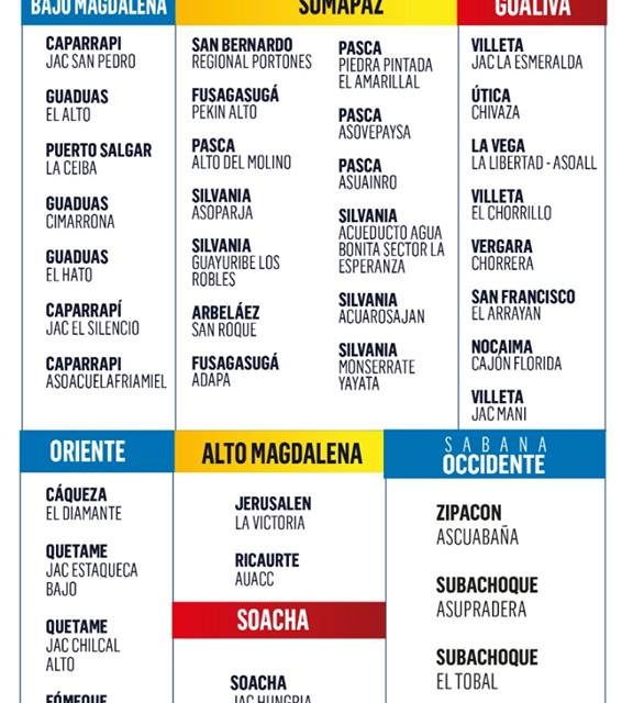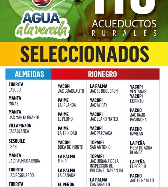 Aquí te compartimos los 110 acueductos seleccionados que completarán la meta de 300 planteados en el plan de desarrollo Unidos podemos más, beneficiando al final a más de 200 mil habitantes del campo cundinamarqués.  La inversión será de más de $7.000 millones.