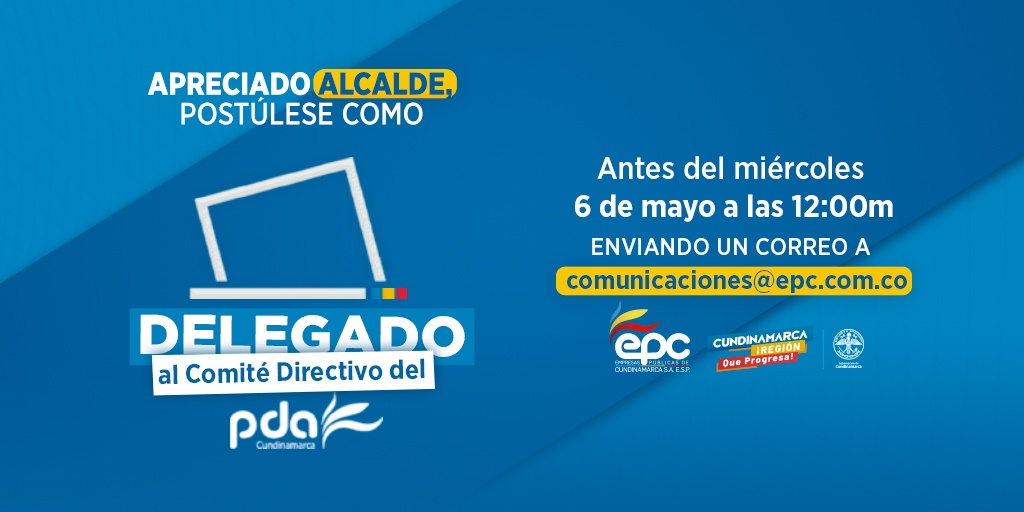 Empresas Públicas de Cundinamarca S.A. ESP informa a los alcaldes de los municipios vinculados al PDA, que está abierta la convocatoria para su postulación hasta el 6 de mayo a las 12:00 del día. Es la primera vez que está elección se realizará virtualmente debido a la emergencia sanitaria decretada por el gobierno nacional ocasionada por el Covid-19.