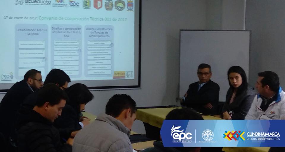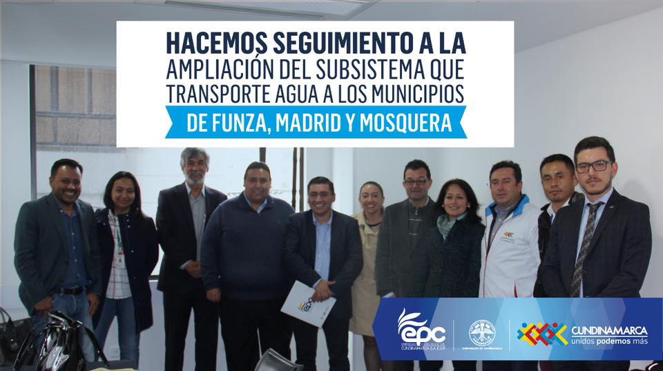 En el marco del convenio No. 001 de 2017 celebrado entre el Acueducto de Bogotá (EAB), Empresas Públicas de Cundinamarca S.A. ESP (EPC) y los municipios de Funza, Madrid, Mosquera, La Mesa y Anapoima, se llevó a cabo una mesa de trabajo con el propósito de hacer seguimiento a los avances en los diseños de: Ampliación de la conducción que transporta agua a los municipios de Funza, Madrid y Mosquera y que en futuro abastecerá adicionalmente a los municipios de La Mesa, Anapoima y Facatativá.